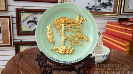 宣城亞邦化工有限公司十周年慶典紀(jì)念鐵畫龍泉青瓷金畫迎客松