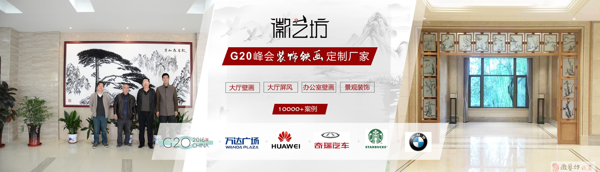 鐵畫既有國畫的神韻,又有雕塑的立體美,被譽為“中華一絕”,鐵畫裝飾畫給您帶來高雅藝術(shù)品位。眾多單位一致選擇徽藝坊定制大廳壁畫:萬達、海螺集團、三聯(lián)集團、安徽省政府、振興集團、安徽水科院等。